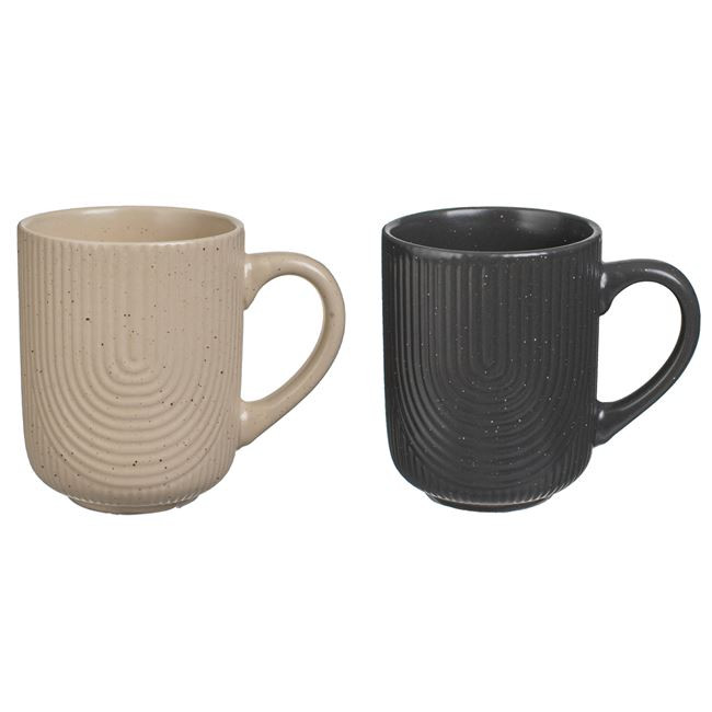 Stílusos mini kerámia bögre bézs vagy szürke színben, felületén különleges, dombornyomott fordított ív mintával és finom dekoratív pöttyözéssel.