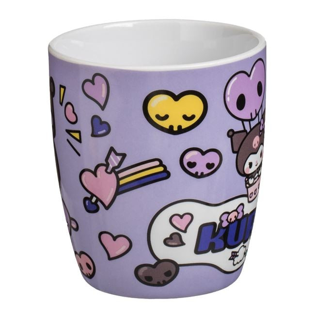 Varázsolja különlegessé a reggeleket ezzel az imádnivaló, lila színű mini porcelán bögrével. Az ovális kialakítású bögrét a népszerű Sanrio karakter, Kuromi képe és apró szívecskék díszítik, így minden rajongó számára tökéletes kiegészítő.