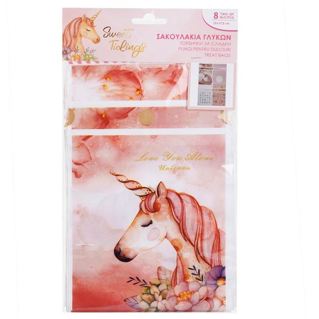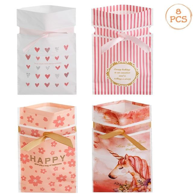Tegye különlegessé az ajándékozást ezekkel a bájos, dekoratív műanyag tasakokkal! A készlet 8 darab tasakot tartalmaz, négyféle stílusos és vidám mintával: fehér alapon rózsaszín szívecskés, rózsaszín csíkos, lazacszínű virágos és rózsaszín unikornisos kivitelben.