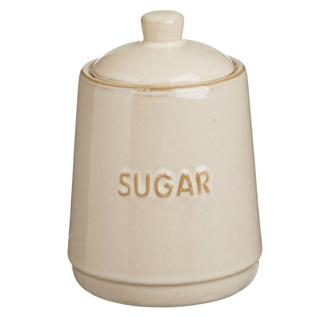 Elegáns kerámia cukortartó a Nordic Style kollekcióból, amely letisztult megjelenésével minden modern konyha dísze lehet. A tároló bézs színű, stílusos sötét peremmel és dombornyomott "Sugar" felirattal rendelkezik.