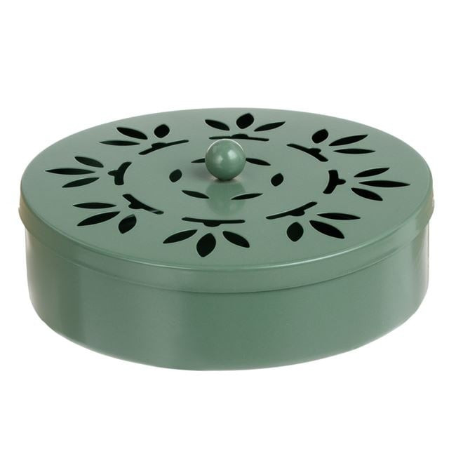 Elegáns és praktikus olívazöld fém tartó szúnyogriasztó spirálokhoz, dekoratív levélmintás fedéllel. Kiváló megoldást nyújt a teraszon, kertben vagy erkélyen a zavaró rovarok ellen, miközben esztétikus kiegészítője marad a környezetnek.