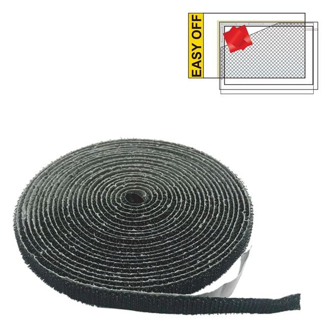 Minőségi, erős tapadású öntapadós tépőzáras szalag, amely kifejezetten szúnyoghálók gyors és egyszerű rögzítéséhez lett kifejlesztve. A fekete színű szalag egyik oldala apró horgos felülettel rendelkezik, amely stabilan tartja a hálót, a másik oldala pedig öntapadós, így szerszámok nélkül is könnyen felszerelhető.