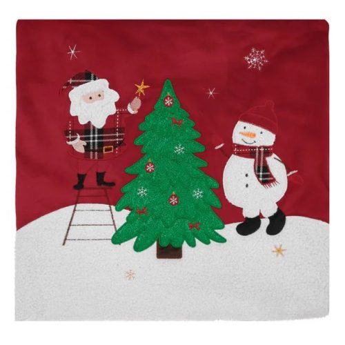 Piros bársonyszövetből készült karácsonyi díszpárnahuzat, melyet Mikulás- és hóemberfigurák díszítenek egy zöld csillogó dekorral ékesített karácsonyfa mellett. Egyoldalas kivitelben, cipzárral.