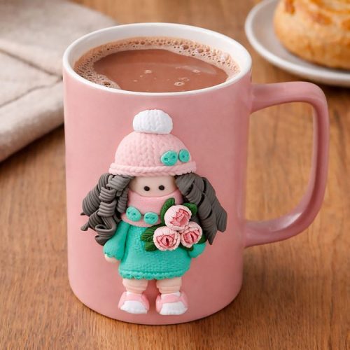 A bögre oldalát egy 3D-s süthető gyurma (Cernit) kislány figura díszíti, aki imádnivaló rózsaszín sapkát visel, kezében pedig kedves virágokat tart. Kiváló választás ajándéknak hölgyeknek, kislányoknak vagy bárkinek, aki rajong az egyedi, kézműves jellegű kiegészítőkért.