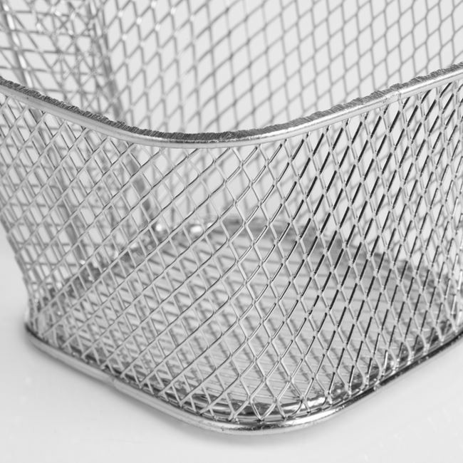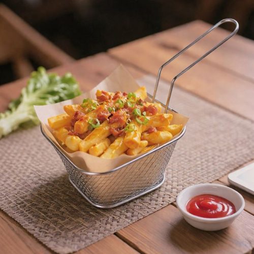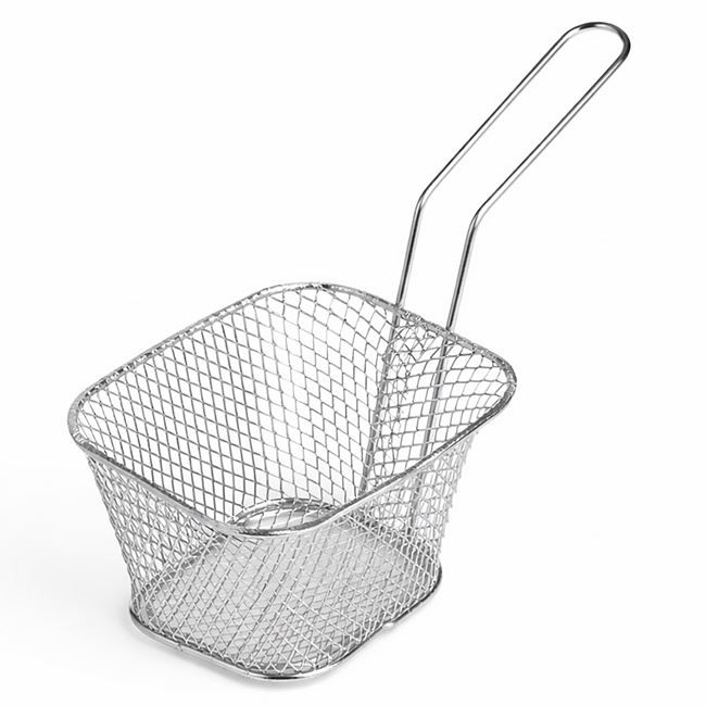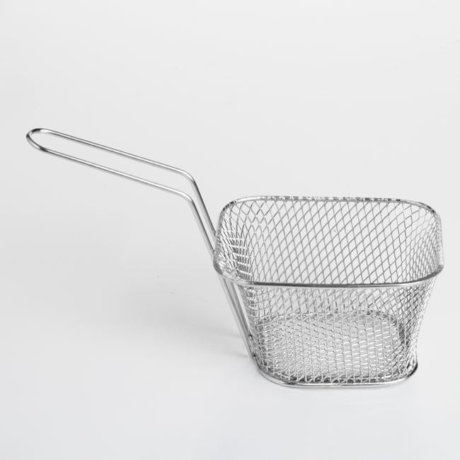Stílusos, fritőz kosár formájú tálaló kosár, amely különlegessé teszi az étkezéseket. Ez a 9x10x6 cm-es, 9 cm-es fogantyúval ellátott kiegészítő tökéletes választás sült krumpli, rántott cukkini vagy bármilyen más sült snack esztétikus felszolgálásához.