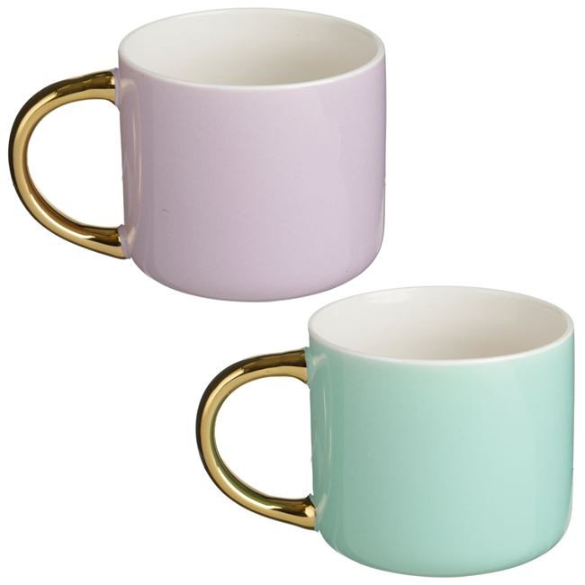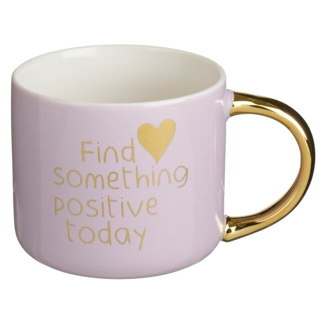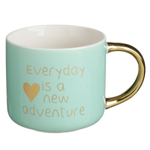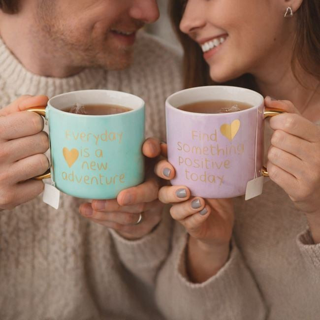 A bögre kétféle változatban érhető el: egy frissítő mentazöld színben, "Every Day is a New Adventure" felirattal, valamint egy lágy lila árnyalatban, "Find Something Positive Today" üzenettel. Mindkét változatot csillogó arany fóliás felirat és elegáns, szintén arany színű fogantyú díszíti.