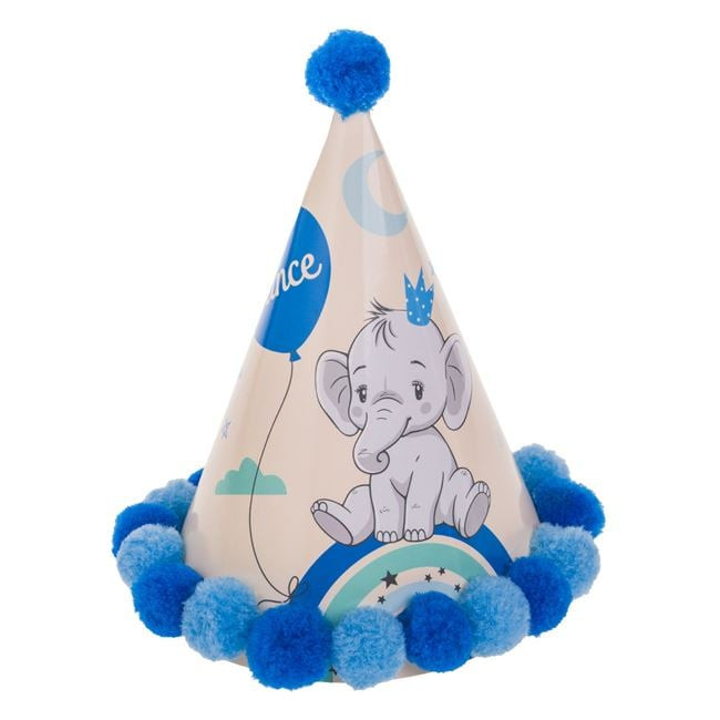 Tedd még különlegesebbé a születésnapot ezzel a bájos, prémium minőségű karton particsákóval! A csákót egy tündéri, koronás bézs elefánt díszíti, amelyet színes szivárvány és egy kék „Prince” feliratos lufi minta egészít ki. A tetején és az alján található puha kék pomponok igazán vidám és ünnepi megjelenést kölcsönöznek a kisfiúk számára.