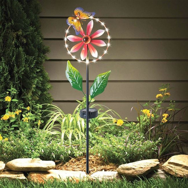 Varázsolja különlegessé kertjét vagy erkélyét ezzel a stílusos, fémből készült szolár kerti lámpával. A dekoratív virág és pillangó motívummal díszített bot 20 darab apró, meleg fehér fényű LED-del van felszerelve, amelyek sötétedés után kellemes, hangulatos megvilágítást biztosítanak.