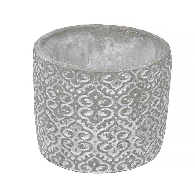 Stílusos, kerek formájú cement kaspó különleges, dombornyomott mintával. A kaspó alján három csúszásgátló talp található, amelyek megvédik a felületeket a karcolódástól és stabilitást biztosítanak.