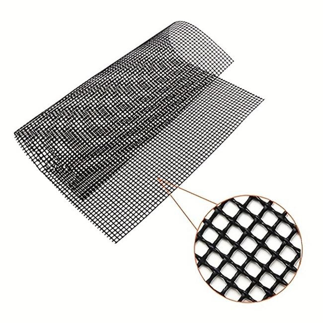 Fekete színű, speciális tapadásmentes felülettel ellátott grillháló, amely hőálló, többször felhasználható és környezetbarát megoldást nyújt a kerti sütögetéshez.