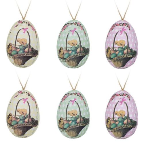 Öltöztesse ünnepi díszbe otthonát ezekkel az egyedi, húsvéti dekorációs tojásokkal! A csomag 6 darab könnyű, habszivacs alapú tojást tartalmaz, amelyeket bájos, kosaras kép és minta díszít. A tojások praktikus akasztóval vannak ellátva, így egyszerűen díszítheti velük a barkaágat, az ablakot vagy a lakás bármely pontját.