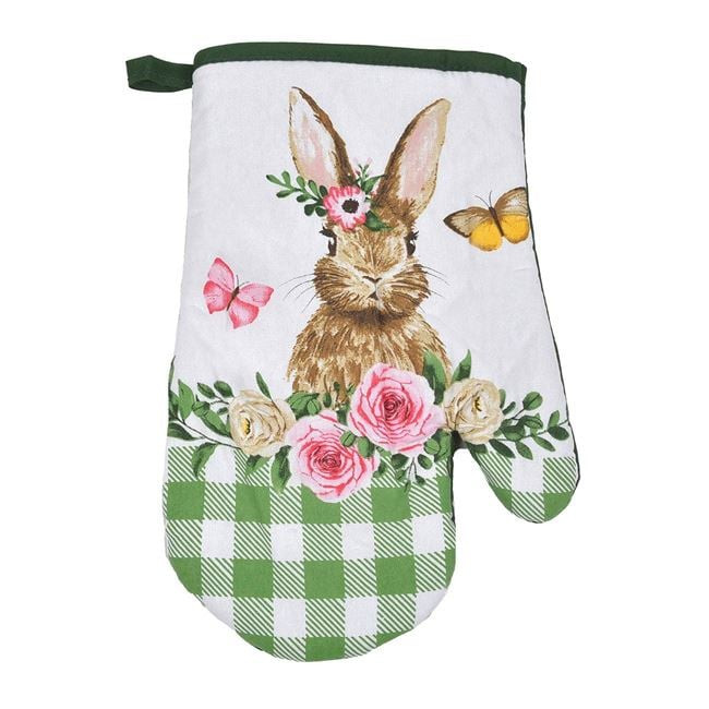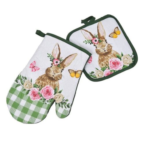 Tegye hangulatossá konyháját ezzel a bájos húsvéti konyhai szettel! A csomag egy kényelmes főzőkesztyűt (18x27 cm) és egy praktikus edényfogót (18x18 cm) tartalmaz, melyeket vidám nyuszis, virágos és pillangós minta díszít.